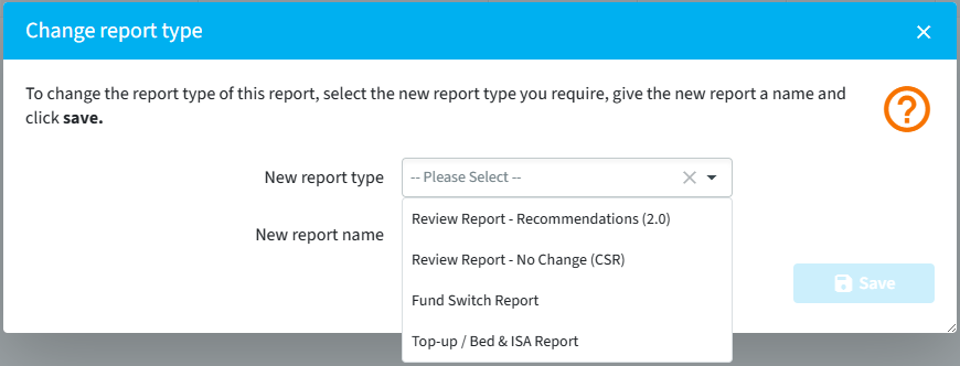 - Want to use a report you previously created for a client as the basis for their new report, but the Report Type required in each instance is different e.g. the original report was a suitability report, and the new one required is a review.